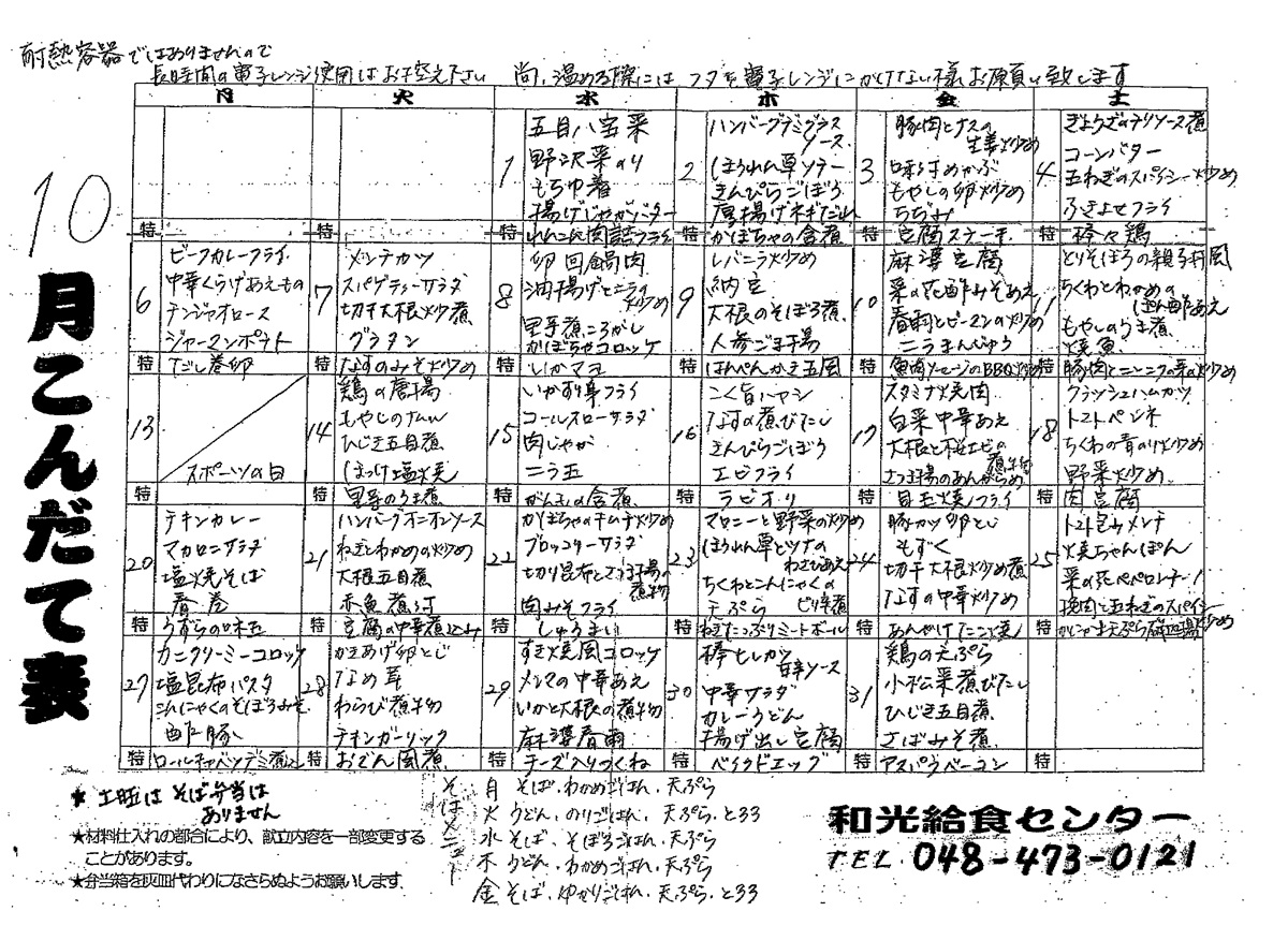 和光給食センターでは、国産米・新鮮食材を使用し、旬の素材を活かしたバラエティ豊かなお弁当作りをしています。 月々の献立表(PDFファイルが開きます)【 2025年10月 】【 2025年9月 】 |