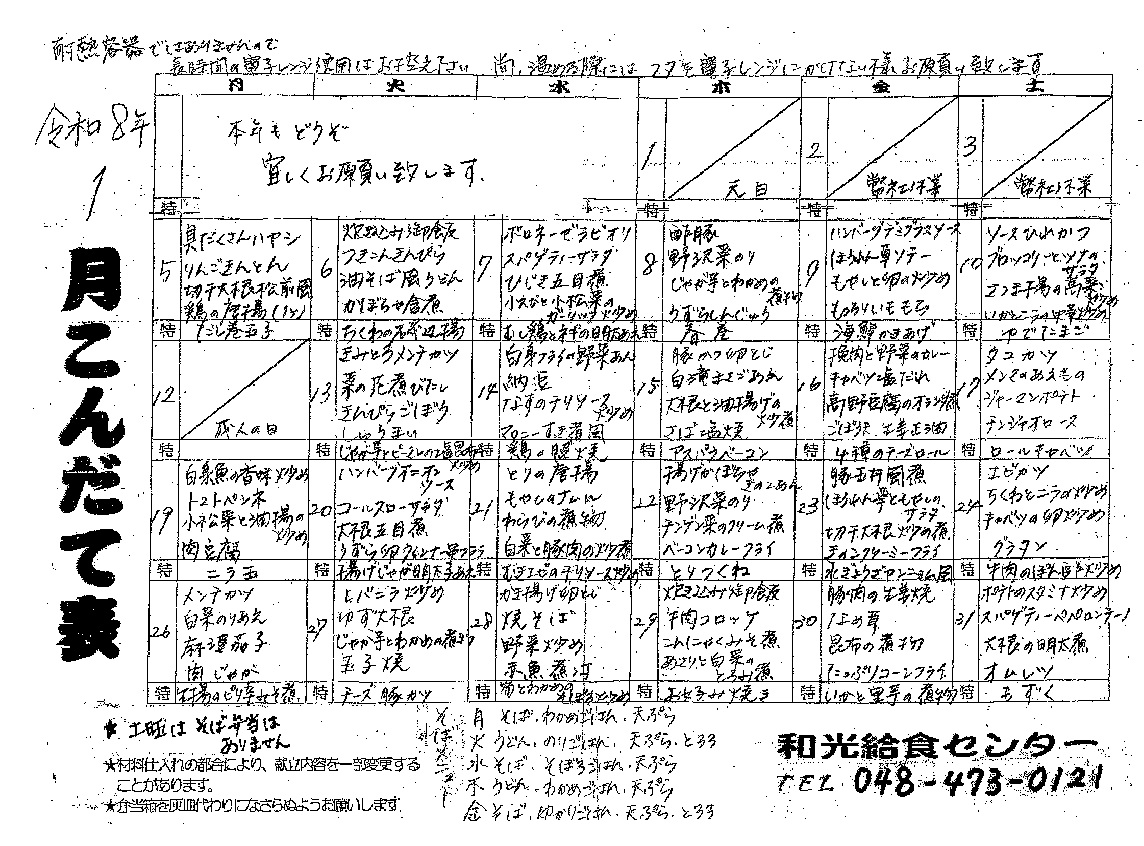 和光給食センターでは、国産米・新鮮食材を使用し、旬の素材を活かしたバラエティ豊かなお弁当作りをしています。 月々の献立表(PDFファイルが開きます)【 2026年2月 】【 2026年1月 】 |